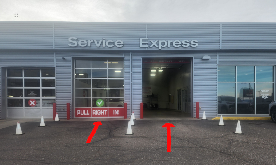 As you arrive, begin making your way through the dealership lot toward the service area. Keep an eye out as you approach. To help guide you, look for the white cones marking the designated path—they’ll lead you directly to where you need to be